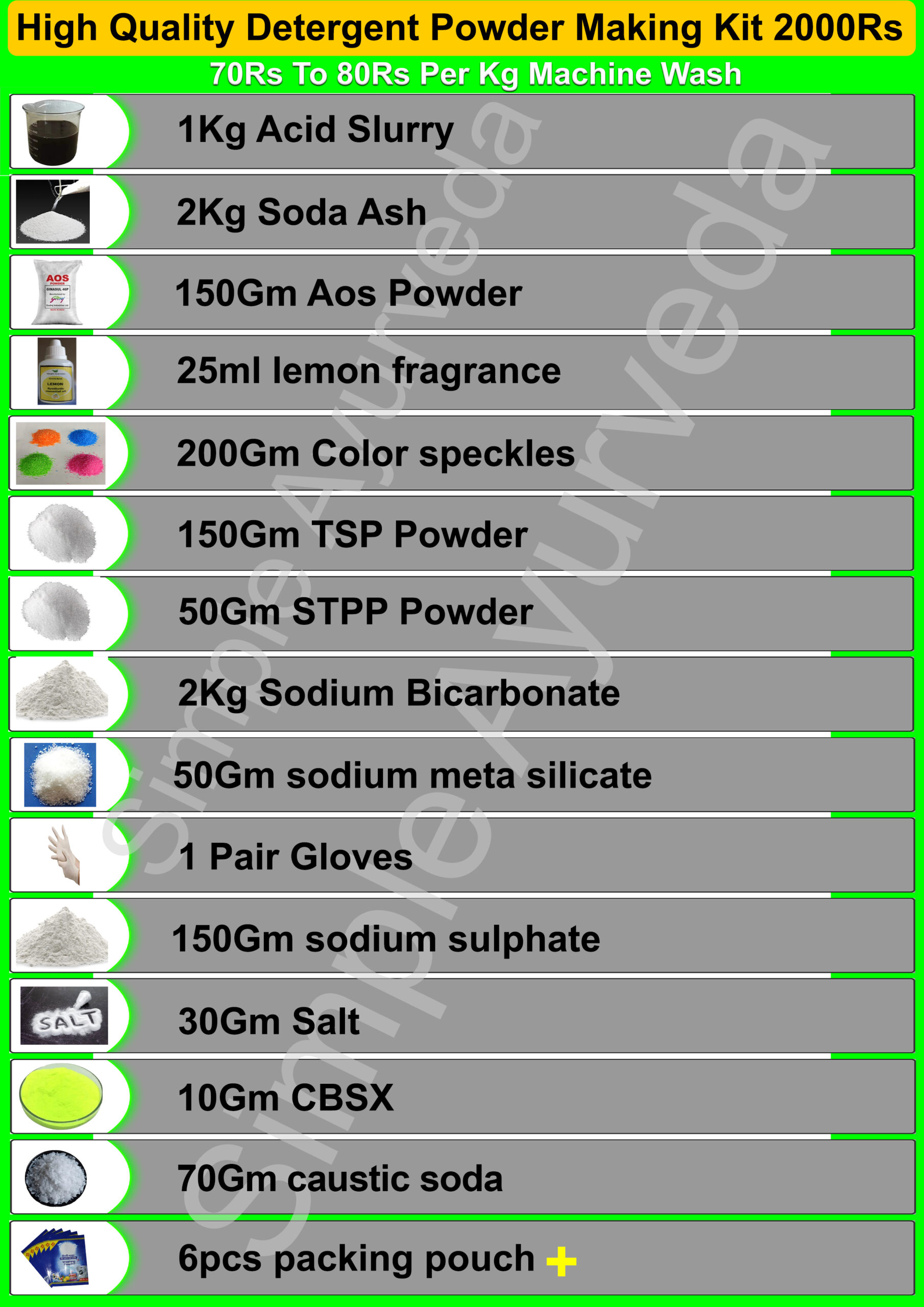 इस kit में detergent powder बनाने के लिए जरूरी selected raw materials दिए जाते हैं जिससे बेहतर सफाई, अच्छी खुशबू और premium quality powder तैयार किया जा सके।